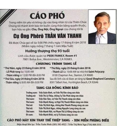 Cụ Ông Phêrô Trần Văn Thanh, thân phụ của anh Trần Văn Tâm HT72, đã được Chúa gọi về lúc 17g ngày 17/8/2018 tại California, hưởng thọ 92 tuổi.