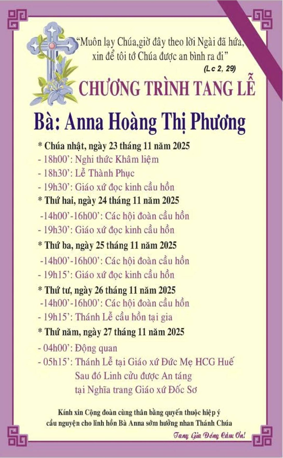 Phu nhân của Niên trưởng Nguyễn Đăng Tình PX53, Bà Anna Hoàng Thị Phương, vừa được Chúa gọi về lúc 21 giờ thứ bảy 22/11/2025 tại Phủ Cam, Huế, hưởng thọ 86 tuổi.