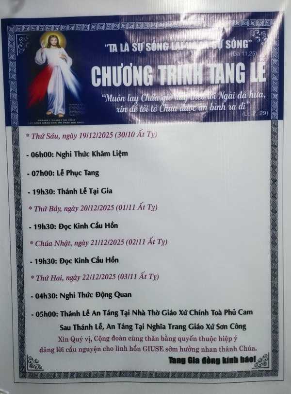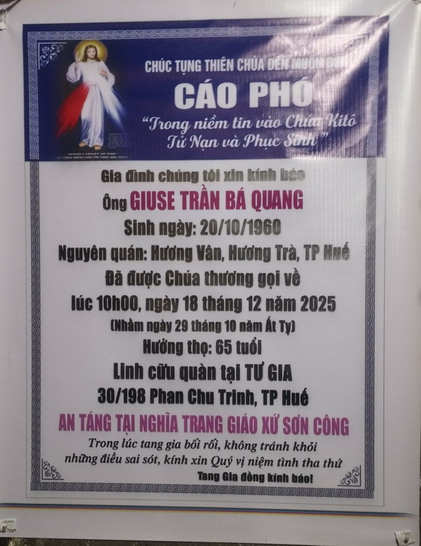 đã được Chúa gọi về lúc 10g ngày 18/12/2025 tại Tp Huế, hưởng thọ 65 tuổi.