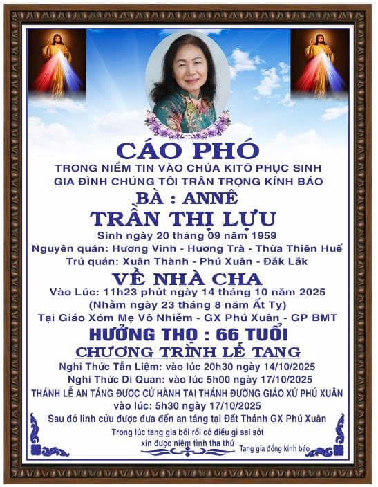 vừa được Chúa gọi về lúc 11g23’ ngày 14/10/2025 tại Banmêthuột, hưởng thọ 66 tuổi.