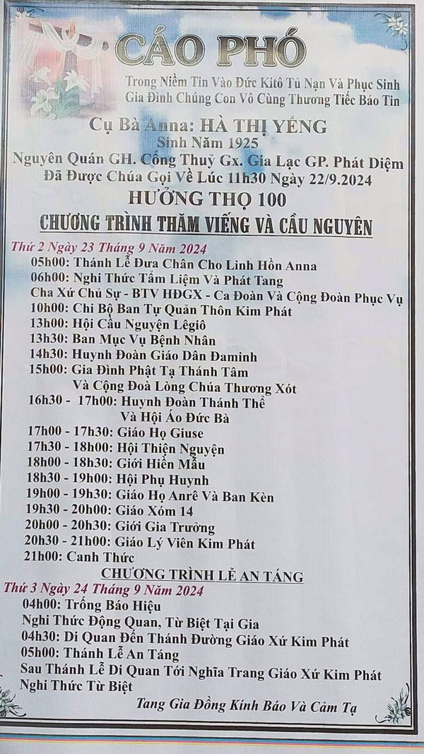 Đã được Chúa gọi về lúc 11g30 ngày 22/9/2024 tại Giáo xứ Kim Phát, Ban mê thuột.