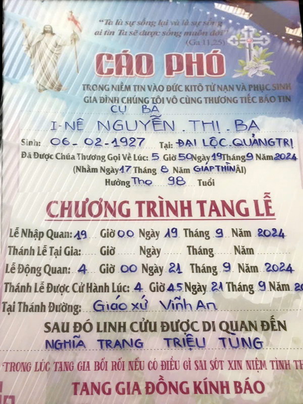 Đã được Chúa gọi về lúc 05g50 ngày 19/9/2024 tại Giáo xứ Vĩnh An, Cam Lâm, Khánh Hòa, hưởng thọ 98 tuổi.