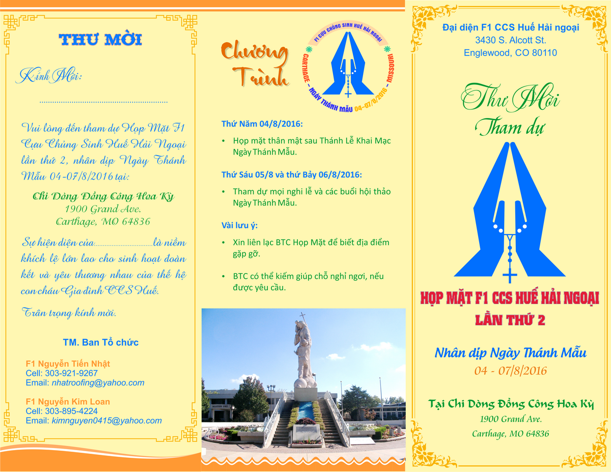 Nhân dịp Ngày Thánh Mẫu tại Carthage, Missouri từ 04-07/8/2016, được phép của BĐH GĐCCS Huế HN, chúng con xin tổ chức và mời gọi Họp Mặt F1 HN, mục đích: