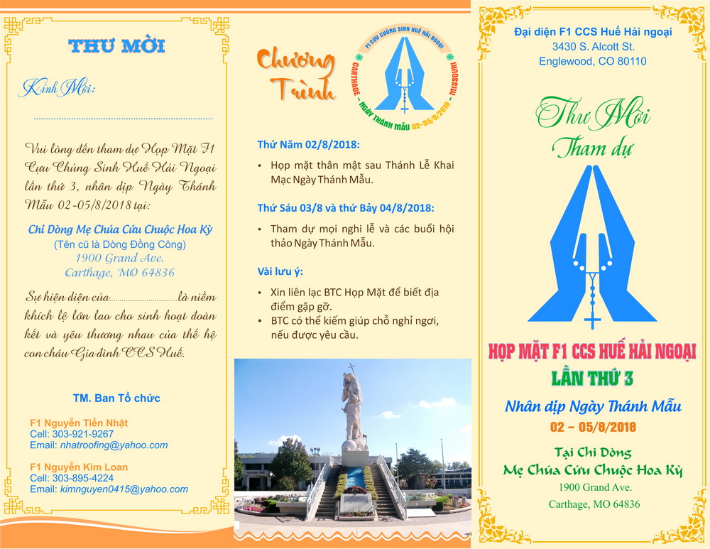 Nhân dịp Ngày Thánh Mẫu 2-5/8/2018 tại Chi Dòng Mẹ Chúa Cứu Chuộc ở Carthage, Missouri, chúng con xin kính gởi Thư Mời Họp Mặt của F1 GĐ CCS Huế HN.