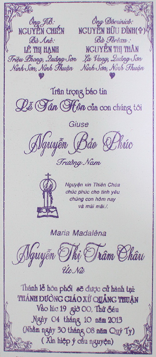 Thánh Lễ Hôn Phối của cháu Giuse Nguyễn Bảo Phúc và Maria Mađalêna Nguyễn Thị Trâm Châu sẽ được cử hành tại nhà thờ giáo xứ Quảng Thuận vào lúc 19g ngày thứ Sáu 04-10-2013.