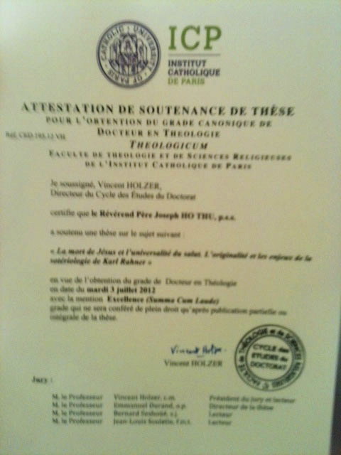 Gia đình Cựu Chủng Sinh Huế và Ban Biên tập xin chúc mừng cha Hồ Thứ HT71 đã bảo vệ thành công luận án tiến sĩ thần học với hạng tối ưu “Excellence” (Summa Cum Laude) vào ngày 03-7-2012 tại Đại học Công giáo Paris.