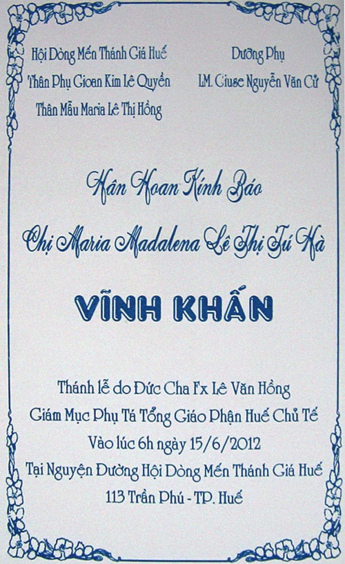 Sr Maria Madalena Lê Thị Tú Hà, là con gái của anh Gioakim Lê Quyền PX61. Thánh lễ Vĩnh Khấn sẽ do Đức GM Phụ tá FX Lê Văn Hồng chủ tế vào lúc 6g ngày 15-6-2012 tại Nguyện đường Hội Dòng Mến Thánh Giá Huế.