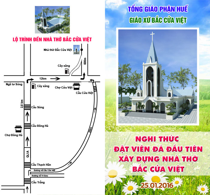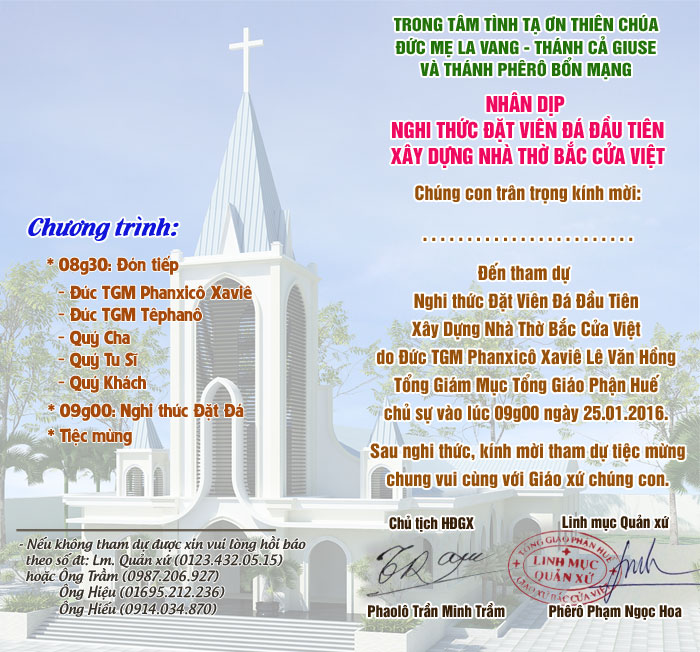 Cha Phêrô Phạm Ngọc Hoa HT69, chánh xứ giáo xứ Đông Hà & Bắc Cửa Việt, TGP Huế, kính mời anh chị em phương xa hiệp thông và cầu nguyện cho nghi lễ đặt viên đá đầu tiên và việc xây dựng nhà thờ Bắc Cửa Việt vào ngày 25-1-2016.