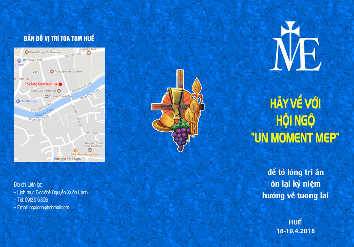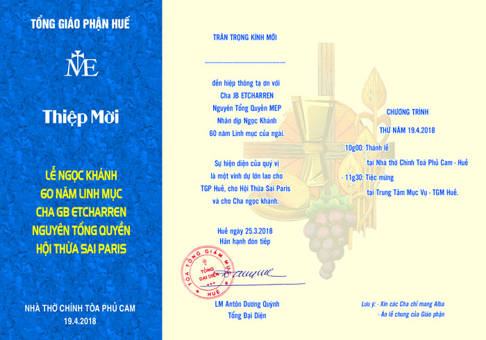 Nhân dịp Ngọc Khánh 60 năm linh mục, cha JB Etcharren, nguyên Tổng quyền MEP, trân trọng kính mời quý Đức Cha, quý Cha, nam nữ Tu sĩ cựu du học sinh do Hội Thừa sai Paris bảo lãnh, về tham dự cuộc gặp mặt UN MOMENT MEP ngày 18, 19/4/2018…