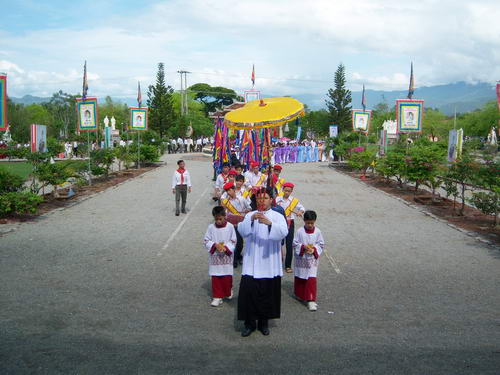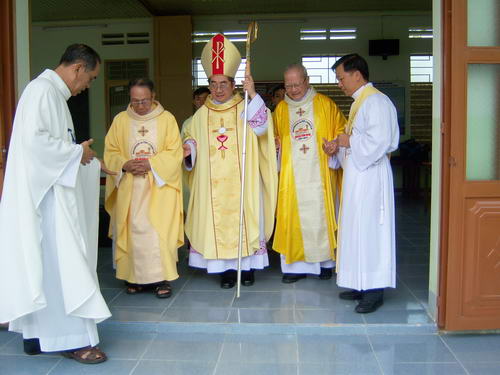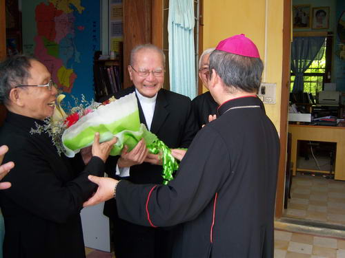 Đức Cha Giuse Võ Đức Minh xuống xe từ ngoài đường và đi bộ mang hoa đến tặng.