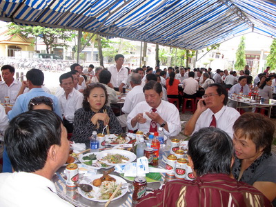 Giờ liên hoan chia sẻ niềm vui diễn ra ngoài sân có mái che, cùng tham dự có thầy giúp xứ gốc Huế, các sơ, hội đồng giáo xứ. Tất cả món ăn đều được chiếu cố tận tình theo cùng thời gian với vỏ bia lăn long lốc.