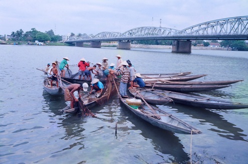 Ngày ngày, ngư dân chèo thuyền đi bủa lưới, bắt ốc dọc sông Hương, thậm chí ngay dưới chân cầu Trường Tiền.