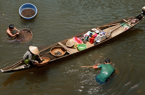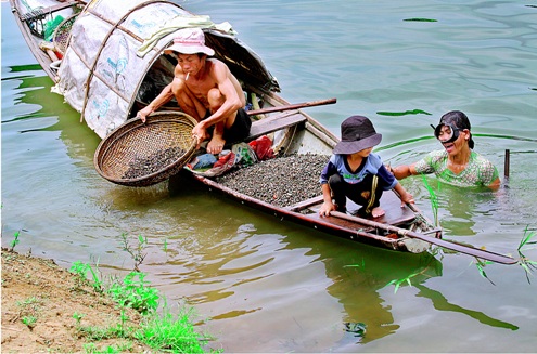Cả gia đình cùng đi vớt ốc, xúc hến dưới sông Hương.