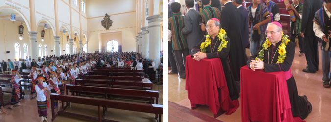 Đoàn cồng chiêng rước Đức Tổng Giám mục Leopoldo Girelli, Đức Tổng Giám mục Phanxicô Xaviê, cùng các Cha, tiến vào Nhà thờ viếng Mình Thánh Chúa.