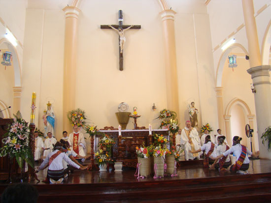 Và để nói lên lòng hân hoan và tri ân Quý Đức tổng, các em dân tộc đã dâng lên Quý Đức Tổng, Quý Cha, điệu vũ của mang bản sắc dân tộc.