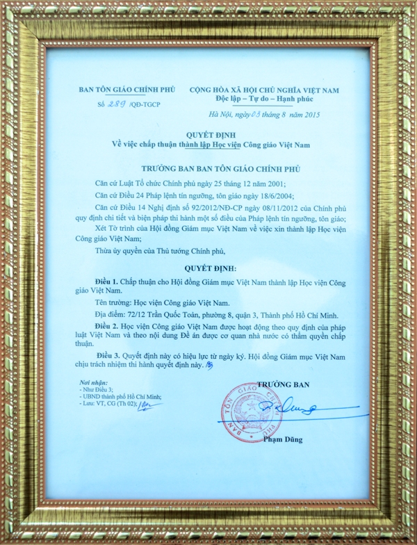 Vào lúc 16g00 ngày 06-08-2015, tại Trụ sở Văn phòng Hội đồng Giám mục Việt Nam (HĐGMVN), số 72/12 Trần Quốc Toản, Phường 8, Quận 3, TP.HCM, đã diễn ra lễ công bố và trao quyết định thành lập Học viện Công giáo Việt Nam.
