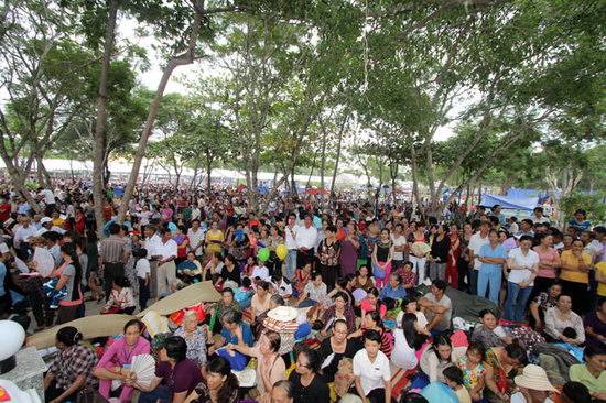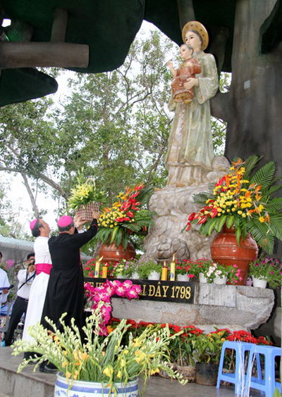 Cộng đoàn hành hương vỗ tràng tay thật dài tạ ơn Chúa, cám ơn Mẹ và các Giám mục. Các Giám mục cắt những khối cầu ba màu. Màu đỏ tượng trưng cho Giáo Phận Hà Nội với dòng sông Hồng màu mỡ. Màu xanh tượng trưng cho Giáo phận Huế với dòng Hương Giang thơ mộng. Màu vàng tượng trưng cho Giáo phận Sài Gòn, như những cánh đồng lúa mênh mông hứa hẹn một mùa bội thu...