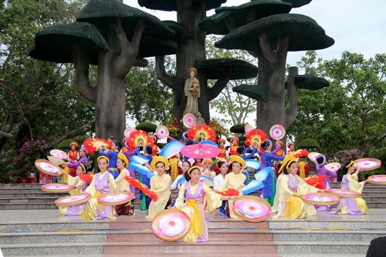 Tiếp đến, các nữ tu Dòng Mến Thánh Giá Huế dâng vũ khúc hoan ca, cùng với những tiếng trống rầm rộ, tạo bầu khí vui nhộn, hân hoan. Một vũ khúc chan hòa tình huynh đệ yêu thương hiệp nhất của toàn thể con cái Mẹ thuộc 26 Giáo phận sống trên ba miền Bắc, Trung, Nam của Đất Nước Việt Nam và hải ngoại.