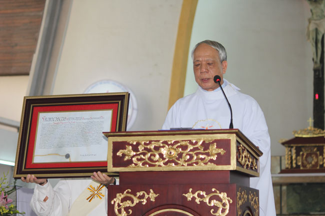 Đức Tân TGM Giuse trao Tông Sắc Bổ Nhiệm cho Cha Niên trưởng Hội đồng Tư vấn Giáo phận Gioakim Nguyễn Văn Hùng, và Cha Niên trưởng long trọng công bố tại thư đài trước toàn thể cộng đoàn dân Chúa hiện diện.
