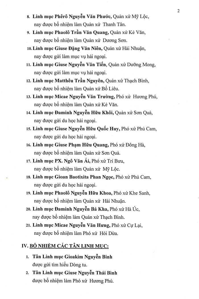 Nhằm đáp ứng các nhu cầu mục vụ trong Giáo phận, Đức Tổng Giám mục Huế đã thuyên chuyển và bổ nhiệm một số linh mục trong Giáo phận như sau: …