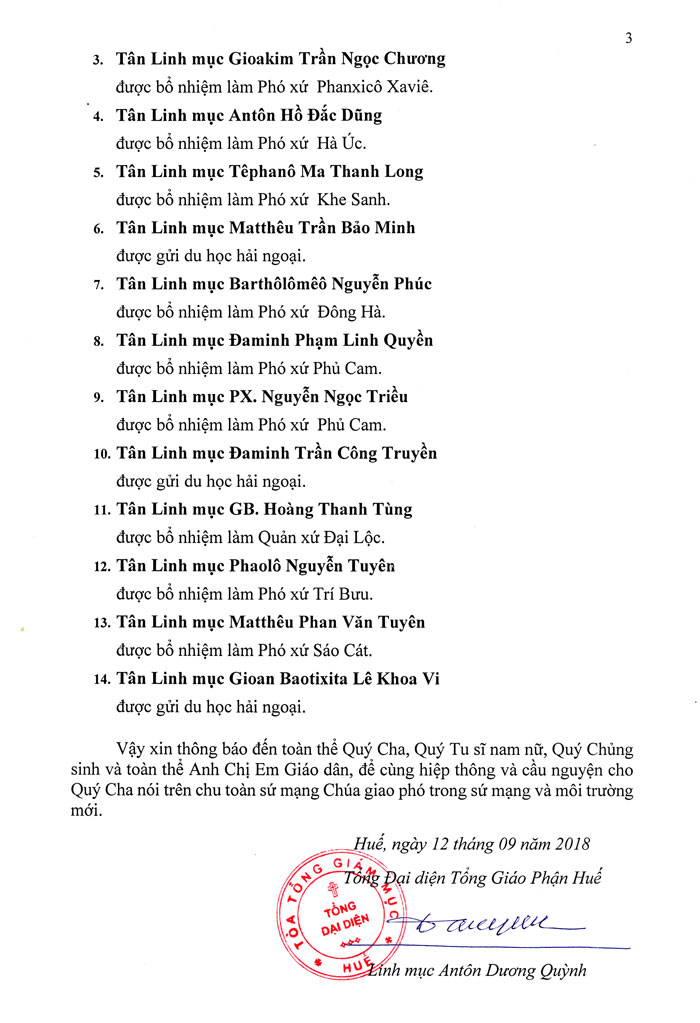 Thông báo của Tòa TGM Huế về việc bổ nhiệm và thuyên chuyển các Linh mục tháng 9.2018
