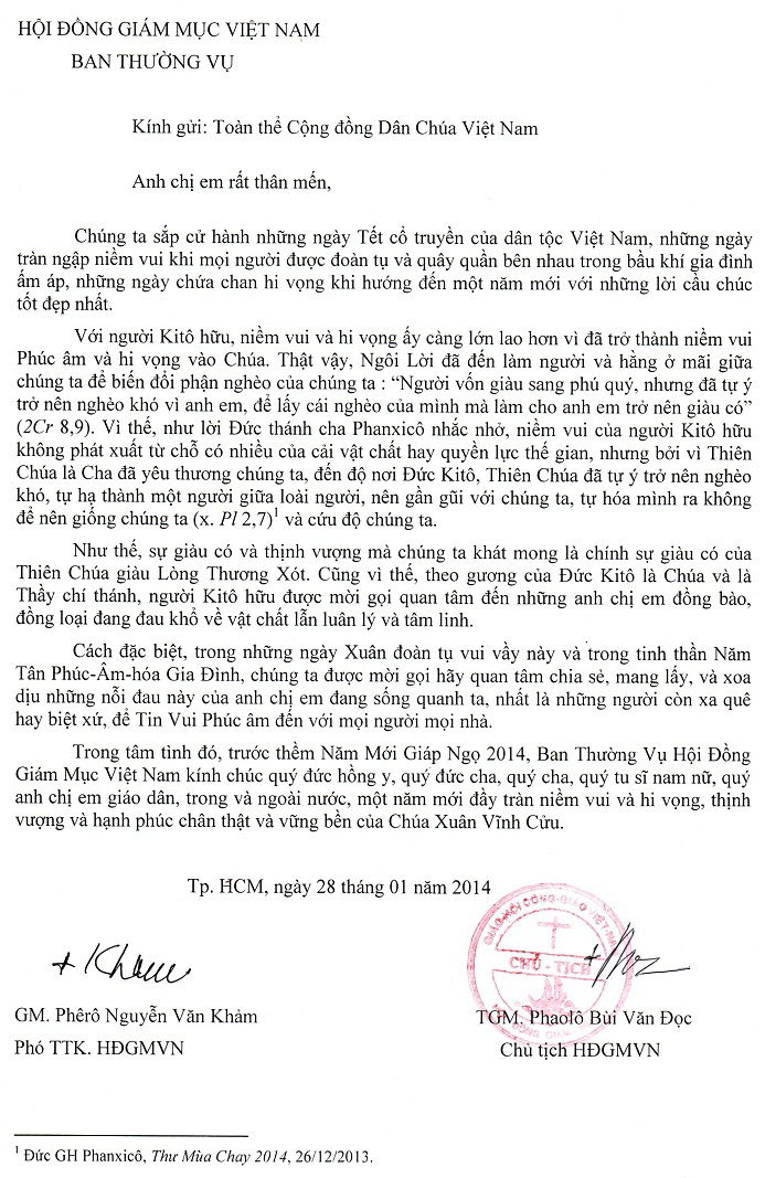 Thư Chúc Tết của Ban Thường vụ Hội đồng Giám mục Việt Nam