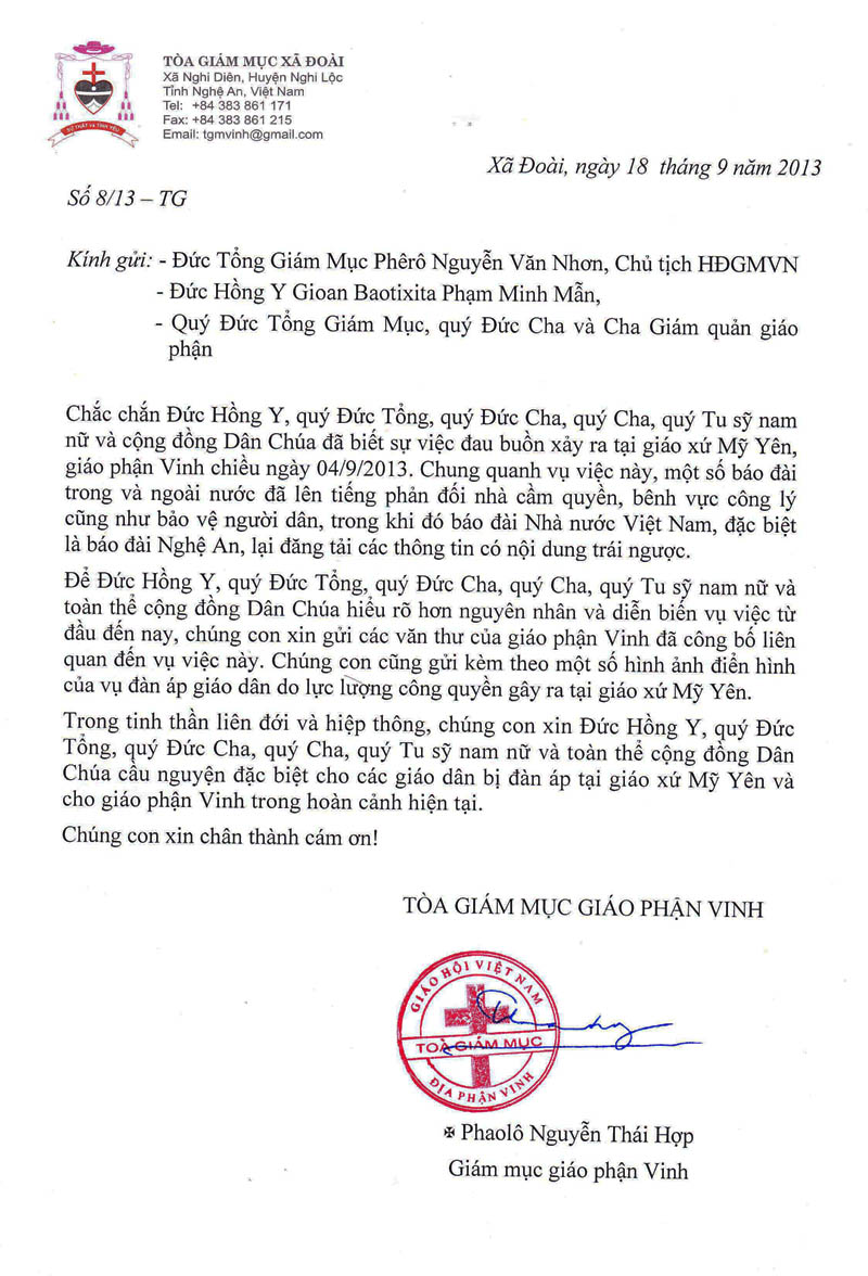 Thư của Đức cha Phaolô Nguyễn thái Hợp, GM giáo phận Vinh gửi các giám mục trong Hội đồng Giám mục Việt Nam
