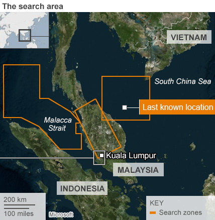 Việc tìm kiếm đang được chuyển hướng từ vùng biển phía đông Malaysia, giáp Việt Nam (ô vuông bên phải) sang phía tây, eo biển Malacca.