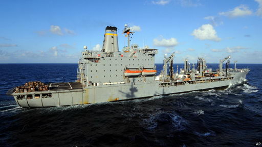 • USNS Tippecanoe, (T-AO-199) một tàu tiếp dầu do Bộ Tư lệnh Hải vận Quân sự Mỹ đóng căn cứ ở Singapore điều hành, đang di chuyển qua eo biển Malacca và trên đường tới địa điểm tập kết để tiếp nhiên liệu và các tiếp tế phẩm cho tàu USS Kidd trong lúc tàu này đang tối đa hóa hoạt động trong khoảng thời gian ở vị trí tìm kiếm. 17:30 GMT+7 ngày 15-3-2014 phút từ Thông báo Hạm đội Bảy, Mỹ