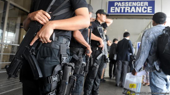 Cảnh sát chống khủng bố được vũ trang đầy đủ tuần tra tại nhà ga thuộc Sân bay Quốc tế Manila hôm 11/3. Các tiết lộ về việc có ít nhất hai người dùng hộ chiếu giả lên chuyến bay MH370 của Malaysia Airlines, hiện đang mất tích, đã làm dấy lên những quan ngại về tình trạng vi phạm nguyên tắc an ninh, gây lo lắng trong toàn khu vực.