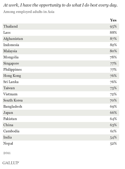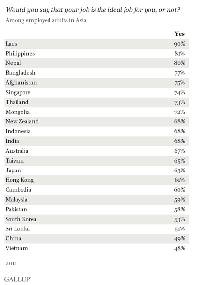 Đây là kết quả khảo sát do hãng nghiên cứu quốc tế Gallup thực hiện năm 2011, công bố tuần trước. Theo đó, người Singapore và Thái Lan đều có mức độ hài lòng với công việc cao hơn hẳn người Việt, từ 73 đến 74%.