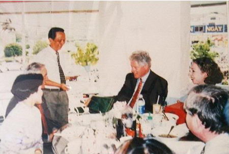 Một hệ thống phở tầm cỡ như thế mới xứng đáng đón tiếp cha con ông Lin-Tơn. Cha con vô tiệm thì dân chúng lại tụ tập đón chờ bên ngoài, chờ ổng ăn xong đi ra để được... bắt tay! Trong đám đông có 3 thiếu nữ xinh tươi, bận đồ vía như ngày hội, là Nguyễn Kim Thanh, Nguyễn Kim Oanh, và Vũ Phương Lan, xôn xao bàn tán chỉ trỏ. Từ dưới đường, người ta có thể thấy rõ bố con ông Clinton ngồi ăn tại một cái bàn gần cửa sổ. Các cô cho biết từ 8g30 phút sáng đã đứng đợi ở phía Tòa Đô Chánh cũ, vì theo chương trình Tổng thống Clinton sẽ ghé đây để gặp các nhà doanh nghiệp Mỹ gốc Việt, nhưng các cô không biết là buổi chiều mới đến mục đó. Cô Phương Lan xuýt xoa: