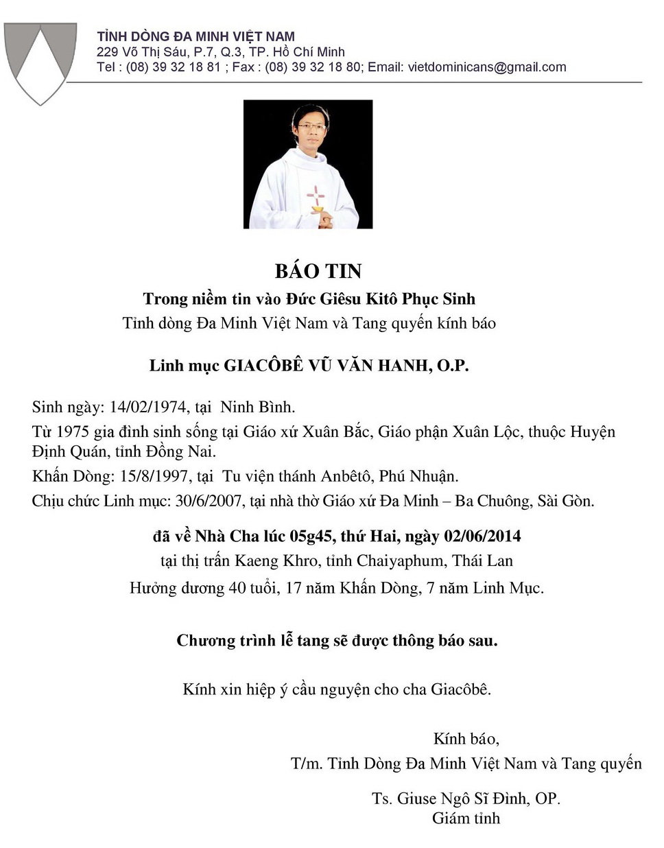 Vị linh mục tử nạn là cha Giacôbê Vũ Văn Hanh, thuộc dòng Đaminh, phụ trách truyền giáo và mục vụ di dân cho cộng đồng người Việt tại Thái Lan.