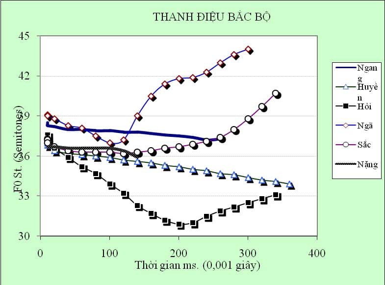 Dưới đây là đồ thị F0 sáu thanh điệu Bắc Bộ (Hà Nội).