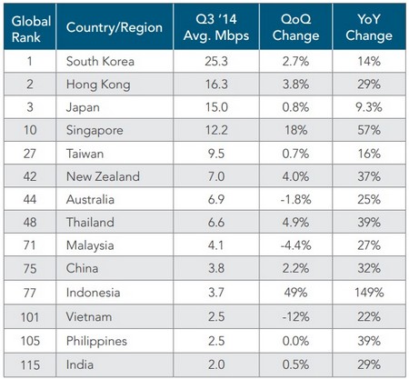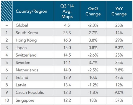 Hàn Quốc tiếp tục là quốc gia có tốc độ Internet trung bình cao nhất, đạt 25,3Mbps, tăng 2,7% so với quý trước và tăng đến 14% so với cùng kỳ năm ngoái. Trong đó có đến 66% người dùng tại Hàn Quốc sử dụng đường truyền có tốc độ lớn hơn 15Mbps.