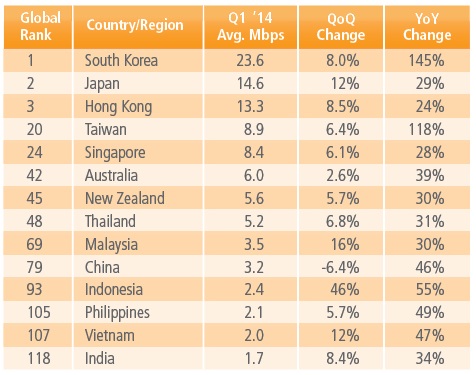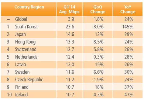 Hàn Quốc tiếp tục là quốc gia có tốc độ Internet trung bình cao nhất, với 23,6Mbps, tăng 8% so với quý trước và tăng đến 145% so với cùng kỳ năm ngoái. Trong đó có đến 60% người dùng tại Hàn Quốc sử dụng đường truyền có tốc độ lớn hơn 15Mbps. Hàn Quốc cũng là quốc gia có tốc độ kết nối Internet tăng trưởng nhanh nhất trên thế giới.