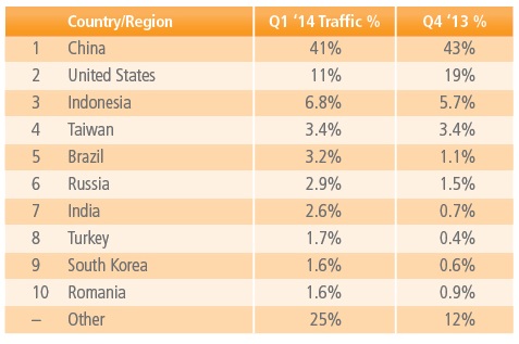 Cũng theo kết quả nghiên cứu của Akamai về tình hình an ninh mạng trong quý I/2014 cho thấy Trung Quốc tiếp tục là quốc gia dẫn đầu về nguồn gốc của các cuộc tấn công từ chối dịch vụ (DDoS) khi có đến 41% cuộc tấn công DDoS bắt nguồn từ Trung Quốc, giảm hơn so với mức 43% của quý IV/2014.
