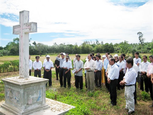 Đến thăm mộ các Thánh Tử đạo ở Trí Bưu, được nghe kể lại cuộc tử đạo của các Ngài lòng người đầy khâm phục. Lăng các Thánh nằm đó giữa một vùng trời xanh bao la, đồng lúa bát ngát, hương lúa, hương sen thoang thoảng mà ngỡ như hương thơm của đất trời, của nhân đức thánh thiện, của lòng trung trinh tỏa bay trong không gian. Viếng mộ Tôma Thiện. Ngôi mộ thật đơn sơ phủ xám màu thời gian. Lời kinh vang lên tha thiết. Ôi các Thánh tử đạo, Tôma Thiện, những bông hoa đẹp đẽ tuyệt vời, ngát hương nhân đức, đã anh dũng nằm xuống cho niềm tin. Các Ngài là loài hoa quý nhất mà sắc hương tồn tại mãi với thời gian. Còn con, lạy Chúa, con chỉ là một bông hoa dại bên đời. Xin cho con giữ vững niềm tin giữa biển đời chông gai. Xin là bông hoa nhỏ đơn sơ, dịu dàng trong khu vườn nhà con. Di tích Tôma Thiện (Nhan Biều – Quảng Trị)