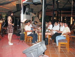 Cương chở tôi đi nhanh một vòng thành phố Huế trước khi đến quán Mục Đồng. Đến quán, thấy có cha Luận, tôi mừng quá. Được biết là cha Luận vừa dâng lễ xong là chạy lên gặp anh em liền dù trời tối - đường xa. Tình anh em là vậy đó… biết răng mà nói cho vừa! Có lẽ biết tôi mê nhạc và mới đến quán này lần đầu, anh em nhường cho tôi cái ghế hạng nhất – ngay trước “sân khấu”. Hà có nói là Minh Phước rất thích nghe nhạc. Tôi không biết Phước thích đến cỡ nào (có lẽ phải kiếm dịp đi Tây để hỏi hắn); còn tôi, thì ngồi nghe say mê lòng rung động theo tiếng hát. Mỗi ca sĩ (một nam và ba nữ) có một giọng ca và phong cách trình diễn đặc sắc riêng. Mỗi người một vẻ - nhưng có chung cùng một “mẫu số”: họ tự giới thiệu bài hát với giọng Huế, ngọt ơi là ngọt! Tôi tiếc là đã không đem theo cái máy thu âm di động chuyên nghiệp (dù đã bỏ vào hành lý rồi lại lấy ra để lại ở Canada). Nếu thu được mấy bản nhạc đã được trình diễn trong quán Mục Đồng rồi về Canada mà nghe thì đỡ ghiền biết bao! Đồng thời, tôi cũng được dịp thưởng thức giọng hát của các ca sĩ HT67: Hà, Long, và Úy (Úy tuy bận nhưng cũng đến kịp để chia vui với anh em ở quán Mục Đồng). Trong tay Chúa quan phòng: Chúng tôi ngồi cho đến hết chương trình hát của các ca sĩ. Trước khi chia tay ra về (cha Luận được Hà mời về nghỉ ở khách sạn), Phương “hy sinh vắng mặt” để chụp cho anh em chúng tôi tấm hình trước quán Mục Đồng. Bắt tay từ giã anh em, xúc cảm chợt dâng tràn, tôi bỏ cách bắt tay thường xuyên, ôm anh em (không có ôm mấy bà đâu nhé) thay lời chia tay. Làm sao mà biết được tương lai… còn có được gặp nhau không. Trong tay Chúa quan phòng, con xin dâng lên Ngài đời anh em chúng con – cả luôn tình mến thương đang đốt cháy trong tâm hồn anh em chúng con. Bún bò Nam Giao – càfé Sông Hương và luật sư đoàn Huế!