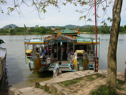 Du khách đến Huế, ai mà không đến chùa Thiên Mụ? Ngoài du khách đến chùa theo đường bộ, khách đi thuyền cập bến chùa không ít. Đây là phương tiện thích hợp để khách nhàn du ngắm cảnh bao la phía thượng nguồn, thưởng ngoạn một phong cảnh tuyệt tác từ bậc cấp đi lên đến con đường với hàng cây xanh uốn lượn khúc quanh theo dòng sông, cho đến tháp Thiên Mụ uy nghi cổ kính, biểu tượng của thành phố Huế.