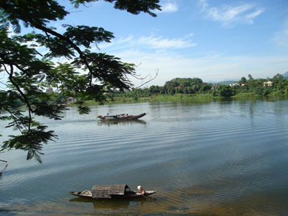 Bạn tiếc gì không đi tiếp ngược dòng sông Hương để thưởng thức cảnh trời mây sông nước ở thượng nguồn? Cho đến nơi mà thuyền không thể lên đươc vì cạn và đá, mời bạn lên bờ sau một hành trình khá lâu. Bờ thì gần nhưng bến đâu không thấy? Đó chính là nơi bạn chọn lên bờ.