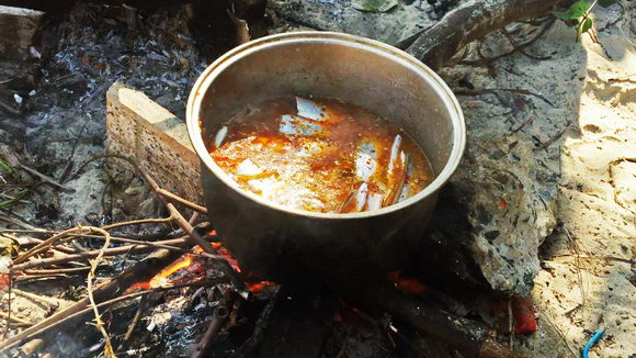 Cá nấu thuyền chài cũng lạ lắm nhé. Nếu tàu đi dài ngày, thì ngư dân nấu luôn trên tàu thì khỏi nói. Nhưng nếu đánh trong ngày, chỉ cần 3 hòn gạch, lên bờ biển, cạnh một bãi cát vắng nào đó kê làm bếp. Củi lửa thì đã có biển đánh dạt lên, cây gãy khô trên bờ biển. Nhóm bếp. Bắc nồi. Chỉ cần cho nước mắm, đôi khi chỉ là muối, ớt, rất nhiều ớt bột, một ít chay… Nước sôi sùng sục thì đổ cá vào. Vài phút là đã có món mặn kiểu thuyền chài. Tôi xin thử. Ngoài cái vị cay xé lưỡi của thức ăn mặn của người miền Trung, thì nấu cá kiểu này, giữ nguyên vị ngọt, vị thơm của cá khi vừa đánh bắt lên. Mấy ông ngư dân, thêm chai rượu khề khà bên bãi biển. Cái thú này, không phải ai cũng được hưởng. Nhưng chắc chỉ là cái thú của mấy đứa thành thị cảm nhận, còn với họ, đơn giản đó chỉ là một bữa cơm. Một bữa cơm từ biển…