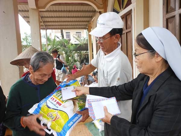 - Tại Giáo Phận Đà Nẵng, chúng tôi đã đến thăm các Giáo Xứ Phú Hạ, Phú Thượng và một số gia đình ở Giáo xứ Cẩm Lệ. Chính nơi đây, chúng tôi đã thấy những ngôi nhà sụp đổ, tróc mái... cây cối gãy rạp, bật gốc... vườn tược xem ra hoang tàn, xơ xác. Người dân cảm thấy lo lắng, bất an về cuộc sống khó khăn và thiếu thốn. Họ rất vui khi ôm vào lòng bao gạo và chút tiền như ôm vào tâm niềm tin tưởng, hy vọng về tình người. Vì họ nhận ra qua chút quà họ nhận hôm nay là trên thế gian này vẫn còn đầy ắp tình người, biết quan tâm, biết chia sẻ, biết đùm bọc đỡ nâng họ khi gặp cảnh khốn cùng.