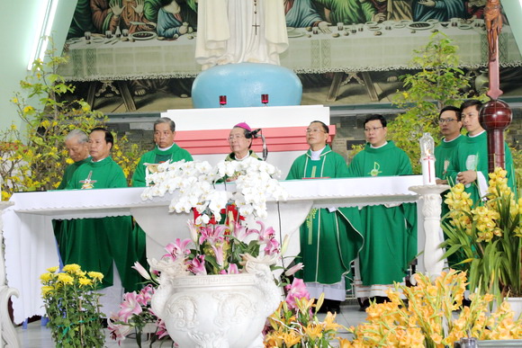 Thánh lễ được cử hành long trọng trong tâm tình tạ ơn Chúa, cầu cho ông bà tổ tiên và những ý lễ bà con xin dâng. Cùng đồng tế với Đức cha Phêrô có cha cố Giuse Trần văn Lộc, Anrê Lê Văn Hải, Phêrô Nguyễn Huệ, Giuse Nguyễn văn Giáo dòng SOLT, Raphael Hoàng Thái Sơn dòng Claret, Mathêu Hoàng Thái Bảo, Lê Thanh Phục dòng CSsR và cha cố Đaminh Nguyễn Đình Cẩm (ngồi xe lăn).