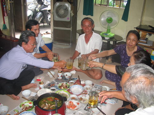 Lại gặp lại nhau qua ngày sau tại nhà Qúy Tống. Không thua gì bữa ăn ngoài Nha trang, cũng lẫu hải sản có đủ tôm, cá, mực. Ôi chao toàn sơn hào hải vị. Vợ chồng Sơn đủ mặt đến với thùng bia góp gió. Lợi cũng như tôi, vẫn còn tiếc nuối không nỡ rời xa bè bạn, cùng hẹn nhau ngày về quê một chuyến. Tiệc trở nên vui vẻ dần khi mùi men hưng phấn, nhà Quý trở nên sôi động đầy ắp tiếng cười vui khi Đầu to hôm nay trở nên hoạt náo, tôi trở nên lu mờ trước hiệp sĩ vì đất nhà của hắn.