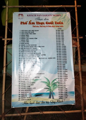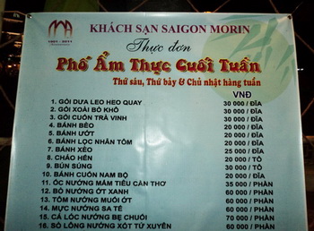 Chưa thỏa thích với dư âm của những món ngon Nam Bộ tại Festival làng nghề Huế 2011, nên khách sạn Sài gòn Morin tổ chức chương trình "Ẩm thực cuối tuần" tại phố đi bộ Nguyễn Đình Chiểu, thành phố Huế dành cho du khách tiếp tục khám phá.