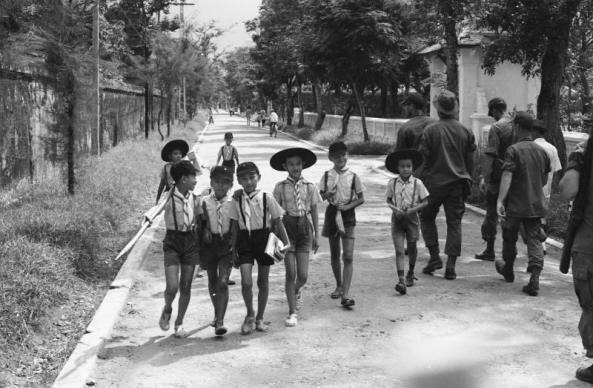 Học trò, không phân biệt giàu nghèo, khi đến lớp chỉ được dùng một thứ bút duy nhất, là bút ngòi lá tre. Gọi là lá tre bởi vì bút có cái ngòi có thể tháo rời ra được, giống hình lá tre nho nhỏ, khi viết thì chấm vào bình mực. Bình mực, thường là mực tím, có một cái khoen nơi nắp để móc vào ngón tay cho tiện. Thân bình bên trong gắn liền với một ống nhựa hình phểu dưới nhỏ trên to để mực khỏi sánh ra theo nhịp bước của học trò. Khi vào lớp thì học trò đặt bình mực vào một cái lỗ tròn vừa vặn khoét sẳn trên bàn học cho khỏi ngã đổ. Bút bi thời đó đã có, gọi là bút nguyên tử, là thứ đầy ma lực hấp dẫn đối với học trò ngày ấy, nhưng bị triệt để cấm dùng.