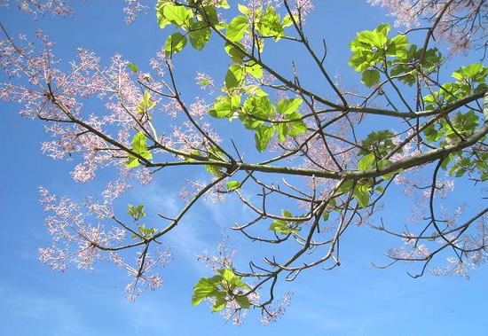Mùa hoa ngô đồng từ tháng 2 đến tháng 5 âm lịch. Cả một tấm màn hoa, sắc hồng phấn chen lẫn tím phớt nhạt nhìn giống đuôi chim phượng hoàng nhảy múa khoe sắc kiều diễm. Chiêm ngưỡng hoa ngô đồng hay nhất chính là lúc nắng ấm. Cánh hoa uốn cong và chụm lại như lồng đèn. Hoa nhỏ, thường mọc thành từng chùm. Phân biệt tuổi đời của ngô đồng bằng cách quan sát số lượng lá trên cây. Ngô đồng còn non lúc ra hoa có chen lẫn lá. Ngô đồng già thì không, cả cây trút hết lá để dồn sức cho những “tấm áo hoa” đẹp đến mê hoặc.