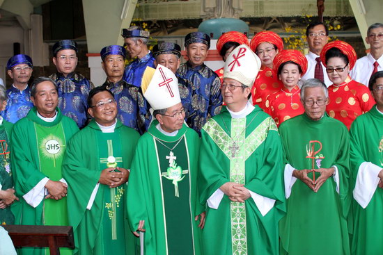 Thánh lễ bắt đầu với Đức Cha Phaolô chủ tế, cùng đồng tế có Đức Cha Phêrô và 8 Cha. Trong bài giảng lễ, Đức Cha Phêrô xoay quanh chủ đề “Năm Tân Phúc Âm hóa gia đình”. Ngài dùng hai câu chuyện tiếu lâm để minh họa tầm quan trọng của cuộc sống gia đình. Có một gia đình thánh thiện, hạnh phúc vì con cái hiếu thảo vợ chồng thương nhau. Người cha qua đời được lên gặp thánh Phêrô. Thánh Giữ Cửa nói đùa chỉ mình ông được hưởng phúc thiên đàng, còn vợ con xuống xuống địa ngục hết. Ông nầy than vãn thôi thánh cho con xuống ở cùng với vợ con, vì không có họ thì cũng không có thiên đàng với con. Câu chuyện thứ hai là một gia đình kia giàu có, nhưng gia đình không êm ấm thuận hòa. Người cha chết, rồi cũng gặp thánh Phêrô. Thánh nói con được lên thiên đàng và nhờ sự hy sinh chịu đựng của con gia đình con cũng được hưởng phúc hết. Người cha khổ sở thưa cùng thánh Cả, cả đời con chung sống như địa ngục đủ rồi bây cho con thoát khỏi hình phạt chung sống. Hai câu chuyện vui nhưng có ý nghĩa sâu sắc. Đối với những người sống trong ơn gọi gia đình, thiên đàng bắt đầu từ gia đình tại thế. Hãy lắng nghe lờì của Đức Thánh Cha Phanxicô “hỡi gia đình, hãy sống niềm vui đức tin” và “hãy biến gia đình thành một công đòan cầu nguyện, thờ phượng Thiên Chúa và đền thờ tại gia”.