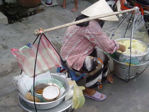 Khi còn nhỏ, sáng nào mẹ cũng ra đầu ngõ mua quà điểm tâm cho chúng tôi. Hồi đó phụ nữ không có thói quen ăn hàng ở vỉa hè như bây giờ. Tất cả đồ ăn làm sẵn được mua về ăn tại nhà, chứ con gái mới lớn cha mẹ không cho ăn vặt ở ngoài đường. Đầu ngõ nhà tôi hầu như là tập hợp của những gánh hàng quà đặc trưng nhất ở Huế. Tôi nhớ không lầm có đến gần chục món ăn được bày bán ở ngã tư Âm hồn, nội thành Huế.